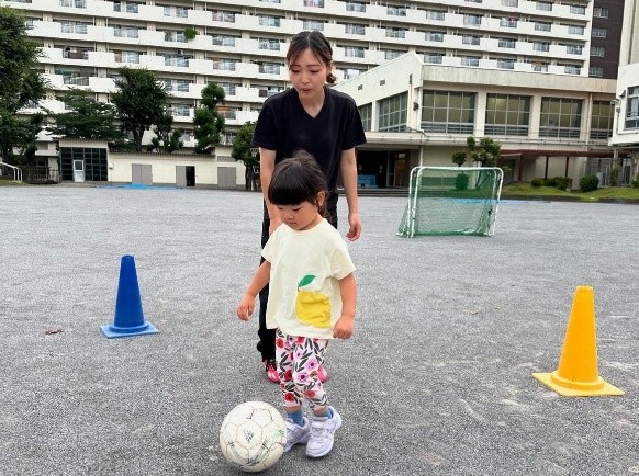 下の子は物心つく頃からママとお姉ちゃんがサッカーをやっていたので、自然と興味を持ったよう。他のメンバーにも同年代のお子さんがいたことから、練習の見学中に一緒にボールを蹴っていることが増え、未就学児向けのキッズスクール立ち上げのきっかけに。