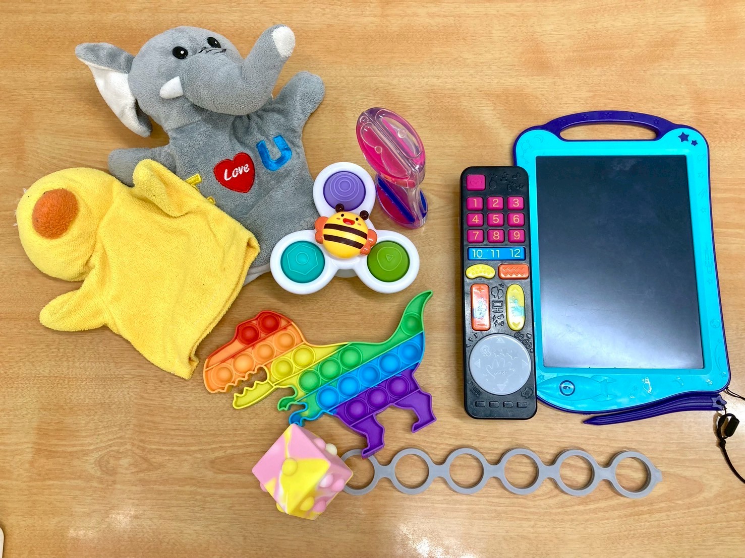 授業内で使用する支援グッズの一例。視覚や聴覚にある程度の刺激を与えてあげることで落ち着いて座っていられる子もいるそう。
