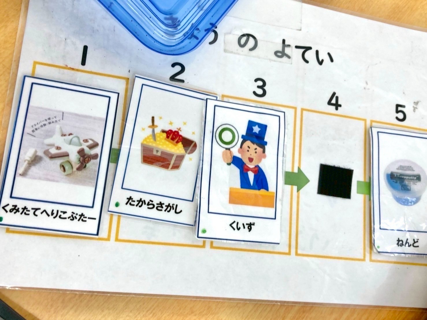 授業では、ねらいに合わせたワークが4~5つほどあり、「やることボード」を使って何に取り組むのかを順番に可視化しています。手先を使うゲームや、数字やひらがなの読み書きワーク、絵本、工作などバラエティ豊かなものばかりです。
