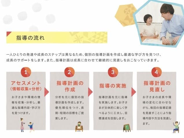 ことばの遅れが気になる、落ち着きがなくよく動き回る、感情のコントロールが苦手、友だちとよくトラブルになる、運動面や学習面で同年代の子より遅れを感じるなどの子どもの成長過程での困りごとや年齢に合わせて教室を選べるのが特徴です。