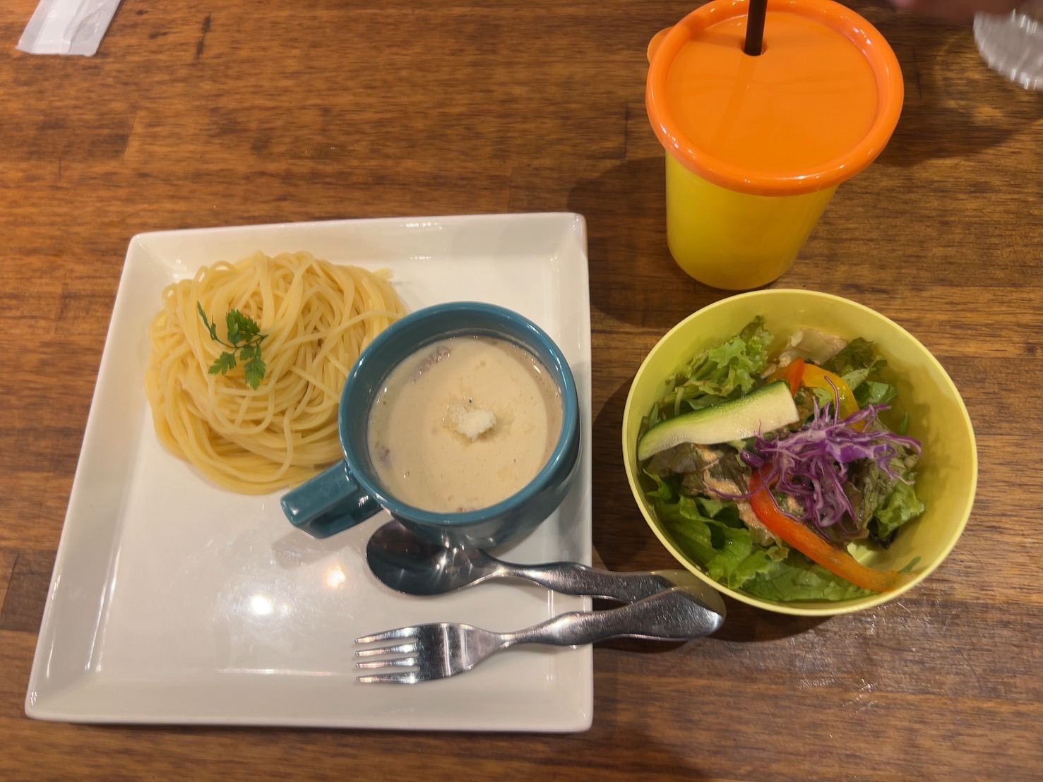 キッズパスタは通常メニューから選べるのですが、香辛料をできるだけ抜いています。量も残さず食べられるハーフサイズです。