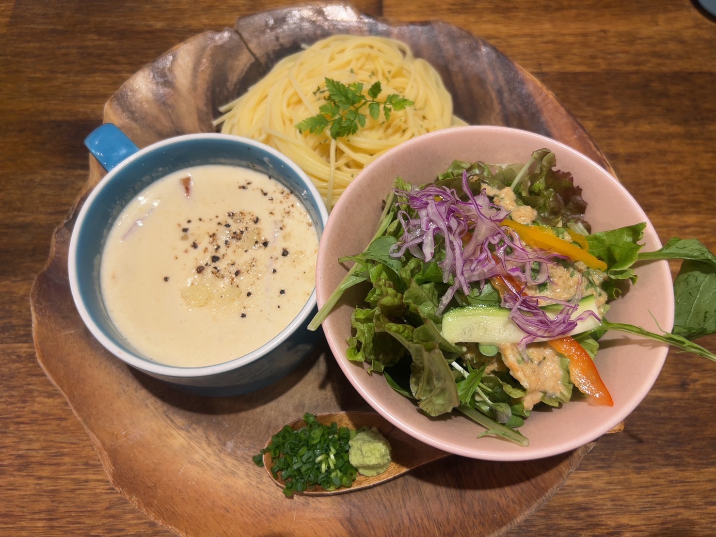 名物のカルボナーラつけ麵は生クリームと濃厚なチーズに、特製の和風だしをブレンドされているそう。初めはそのままのつけだれで、大人はお好みで添えてあるわさびとネギを入れて味の変化を楽しめます。