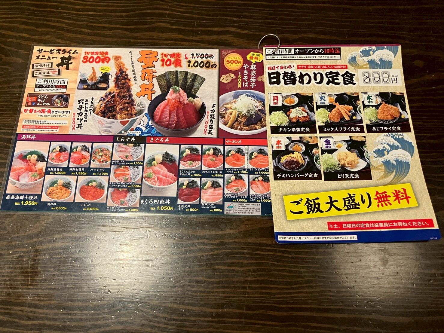 オープンの11時から16時まではグランドメニューに加えて、ランチメニューも注文できます。日替わり定食と海鮮丼…こちらも種類豊富です。