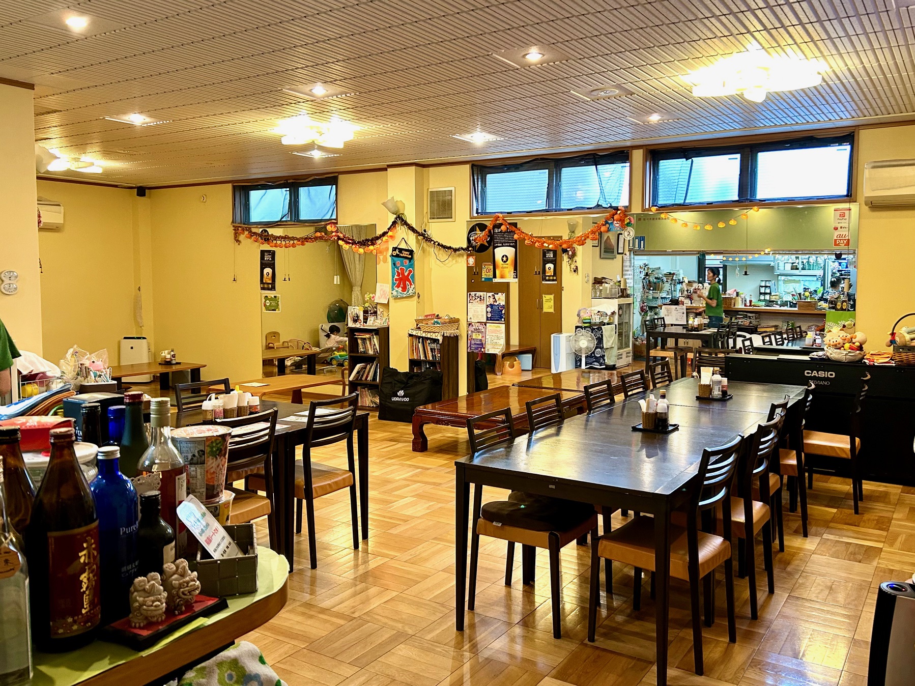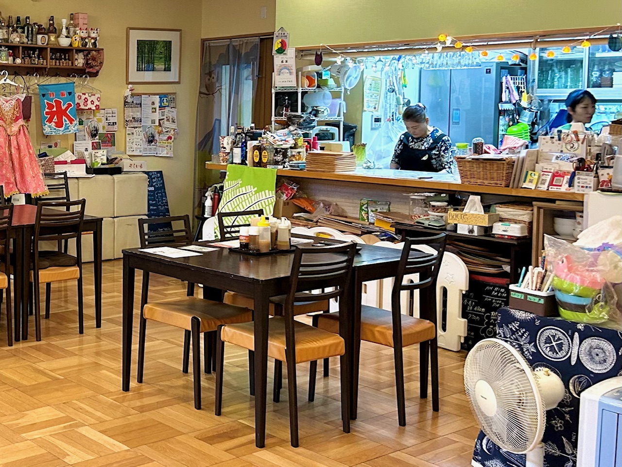 店内は壁一面が鏡張りで広々していて、貸しホールとしても活用されています。地域のおゆずり会やフリーマーケット、ヨガなども開催されています。お店を通じて人と人がつながり、地域コミュニティの拠点にもなっています。