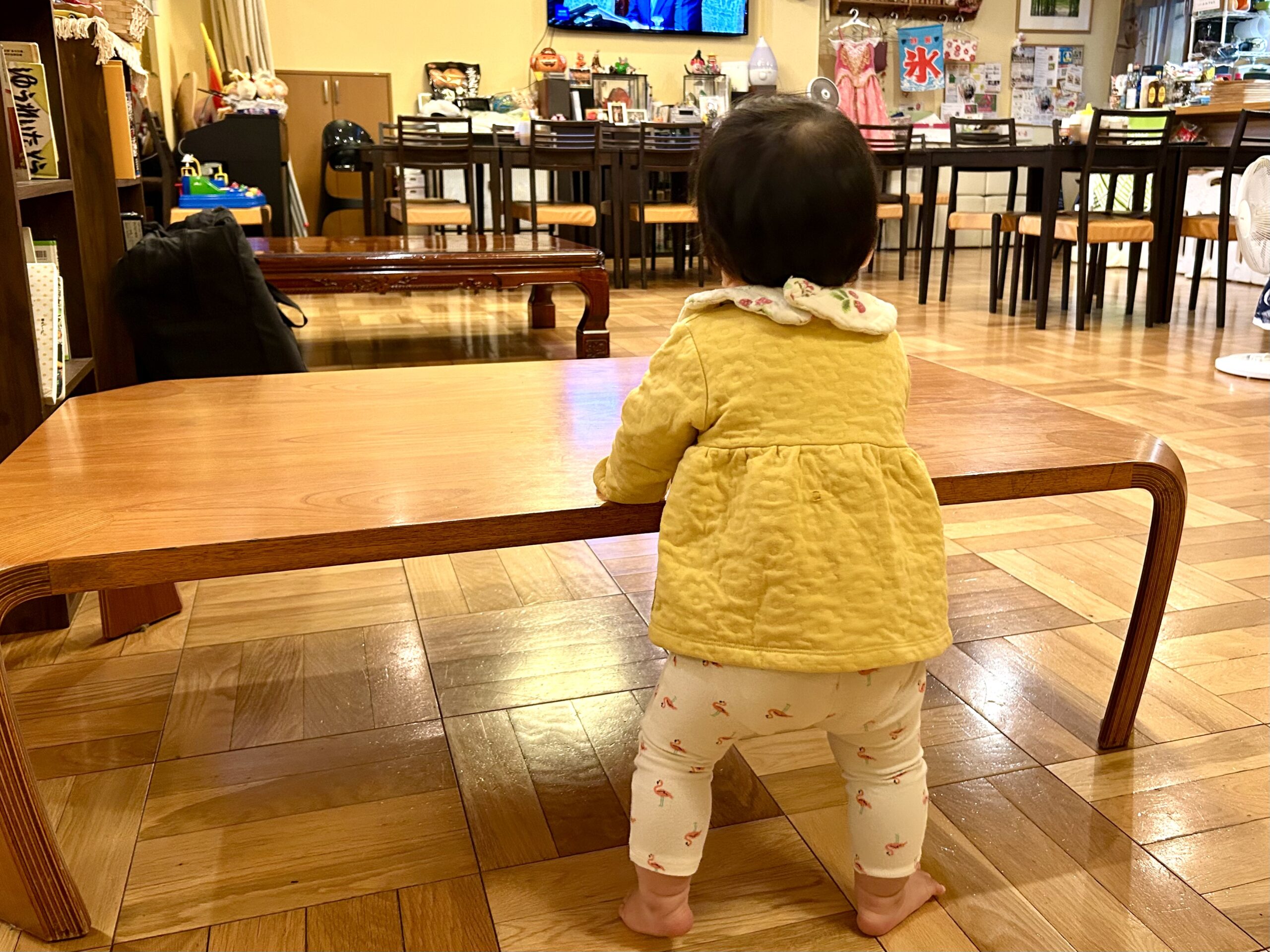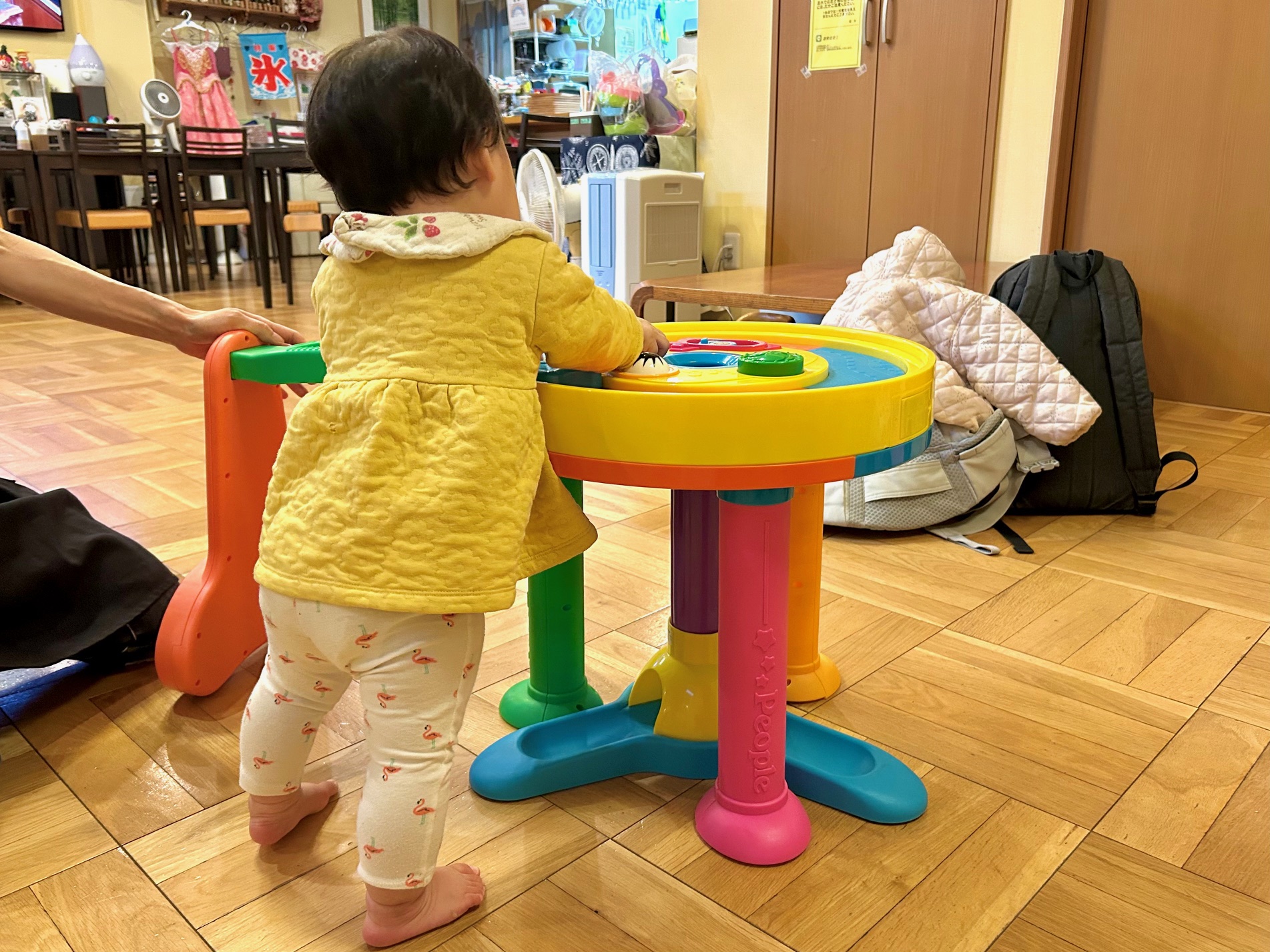 子どもたちはすぐにおもちゃを見つけ、のびのびとくつろぎはじめました。店内にはテーブル席と座卓があり、フロア全体に段差がないためハイハイ期の赤ちゃんも安心です。