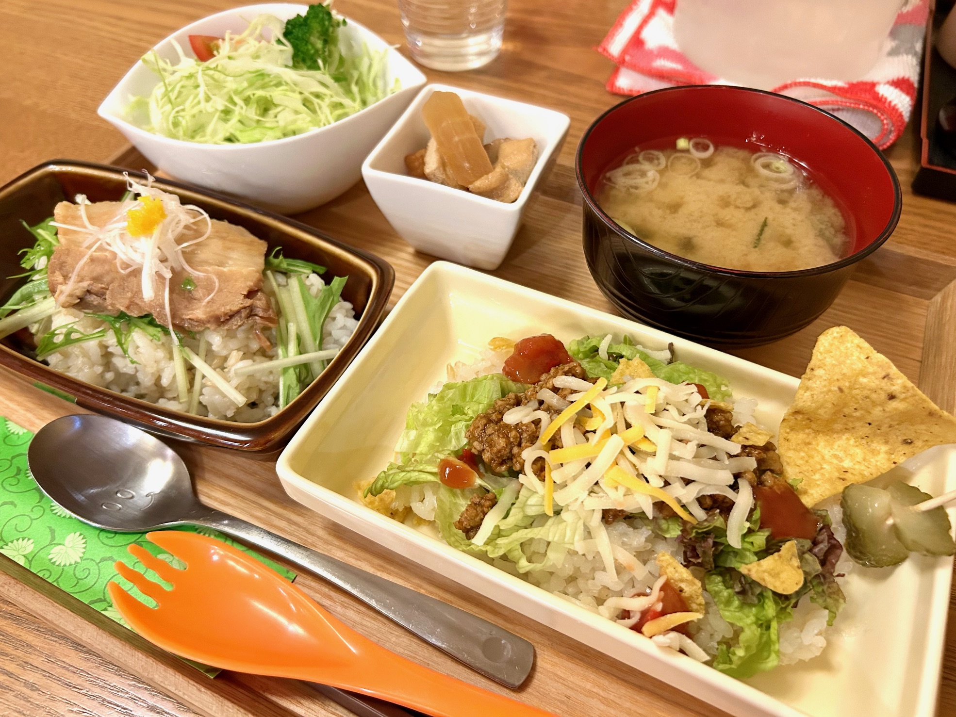 ハーフ&ハーフでの組み合わせも可能で、いろいろな味を楽しめます。(写真は角煮丼とタコライスのハーフ&ハーフ)