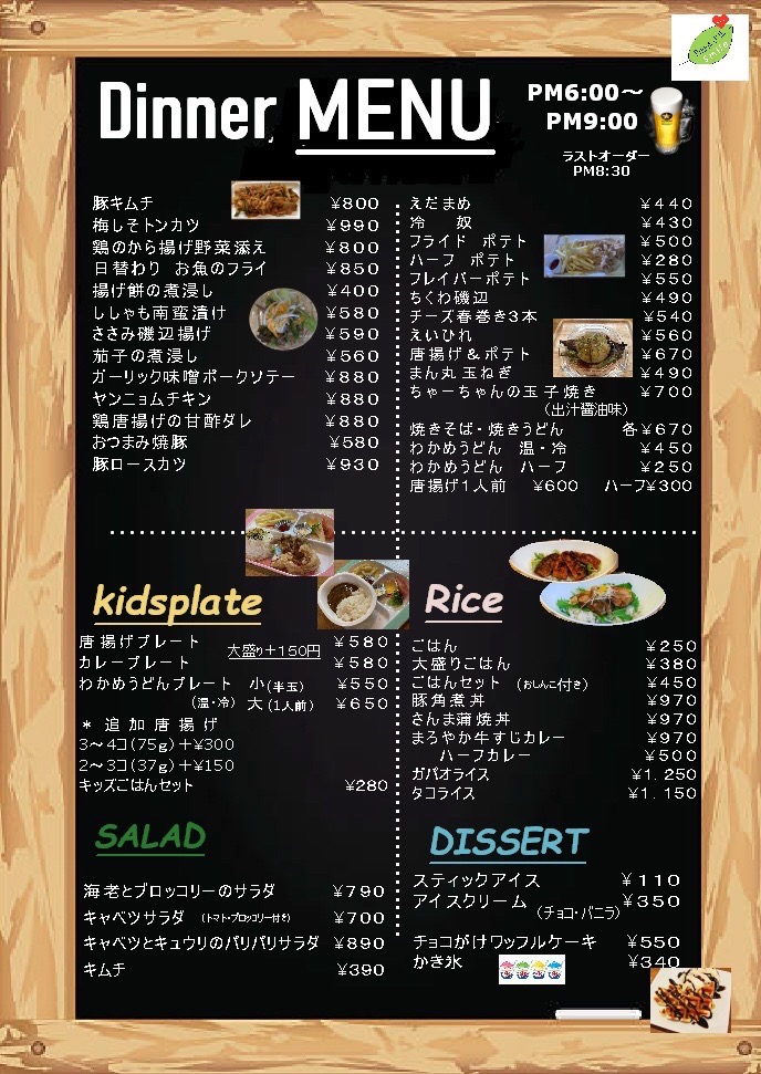 キッズメニューはからあげ、カレー、うどんと充実しています。すべてサラダ・ポテト・ゼリーが付いているのもうれしいポイントです。