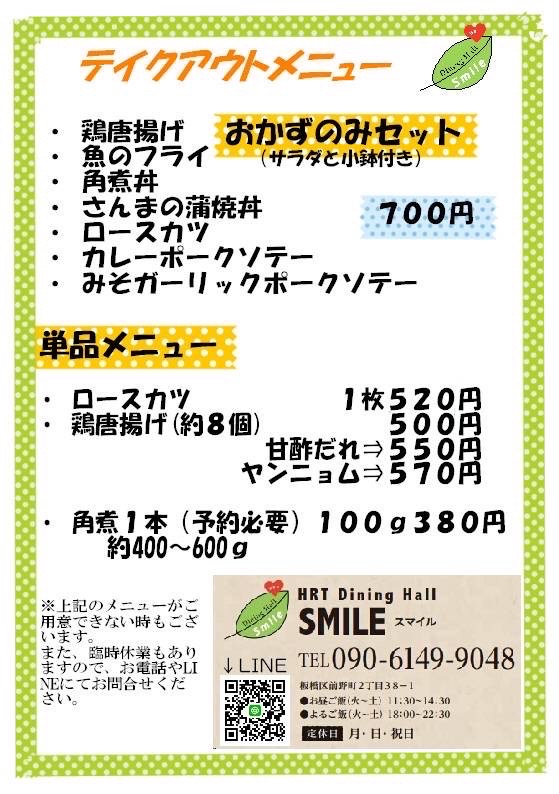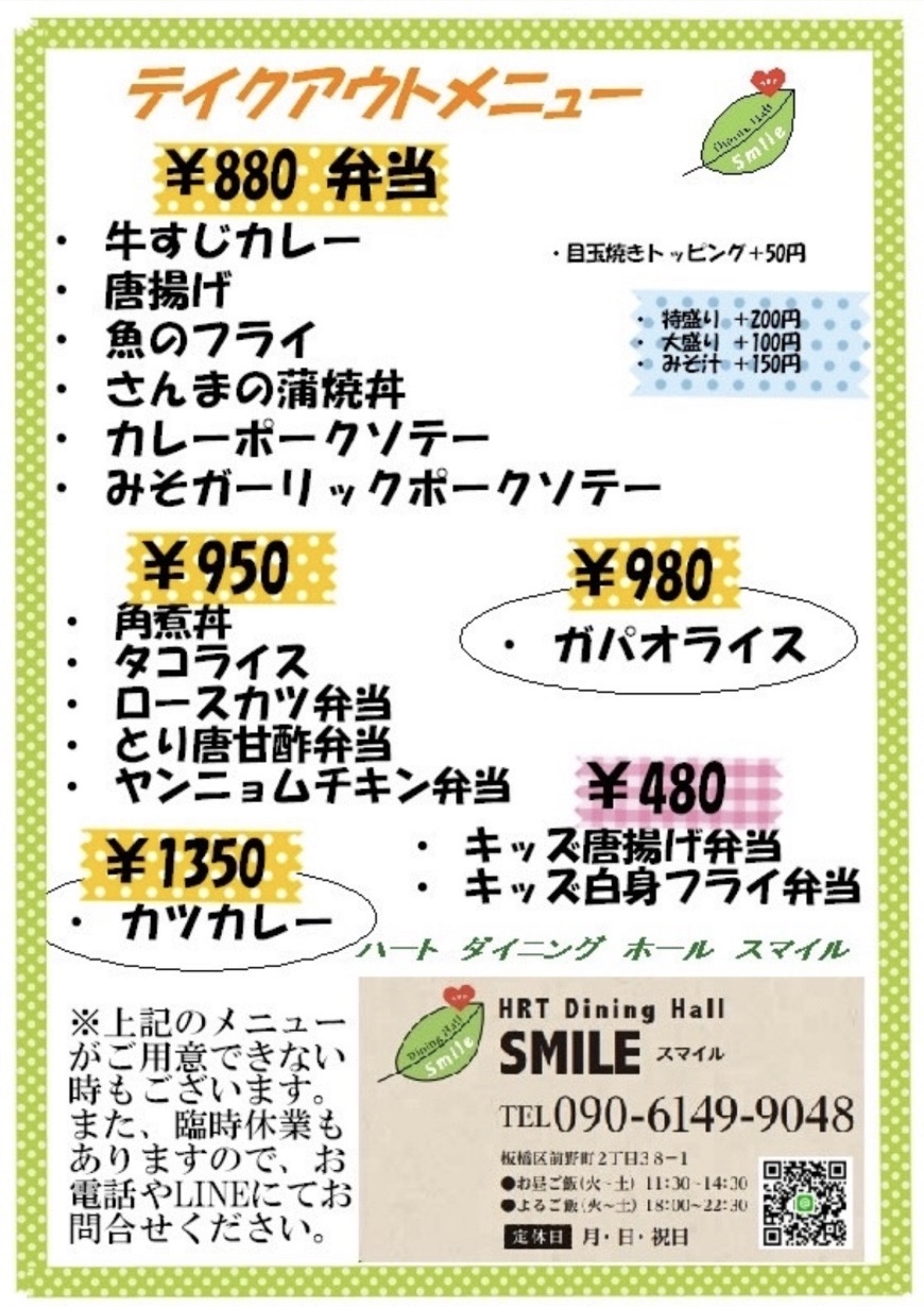 スマイルのごはんは、すべて手づくりです。開店当初は3種類だけだったメニューですが、お客さんのリクエストに応えて今では12種類に増えました。人気メニューは角煮丼やさんま蒲焼丼。夏限定のグリーンカレーも人気です。