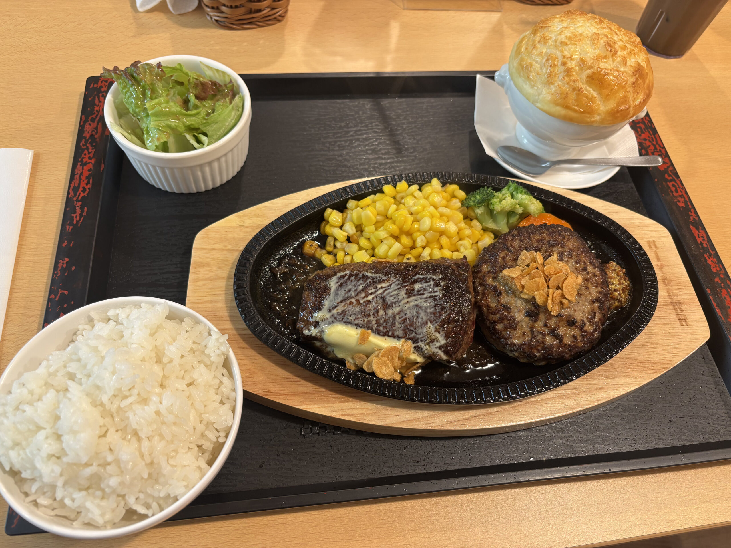 食べ応えのあるステーキとジューシーなハンバーグの組み合わせで、